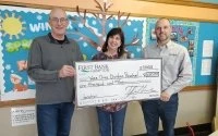 Dave Heuberger and Tyler Heeren presented a donation from First Bank Hampton to Mary Mollenbeck for Wee Ones Christian Preschool of $1000. The preschool promotes hands-on learning and resides in the Church of the Living Word in Hampton.