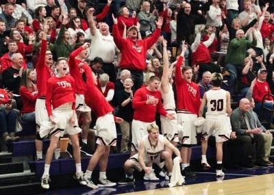 The West Fork bench reacts to a three-pointer by Kayden Ames in the second half of the Class 1A sub-state final at Nevada. The Warhawks are heading back to state for the first time in six years. (Kristi Nixon/Hampton Chronicle)